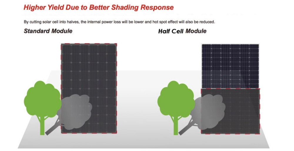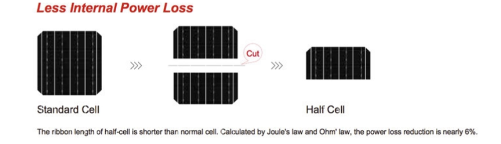 Depuis le tension de le la cellule de silicium cristallin solaire est indépendante de le zone, tandis que le la puissance est proportionnelle à le zone, le tension de une demi-cellule reste inchangée par rapport à le entier cellule, tandis que le puissance et les courants sont divisés par deux.